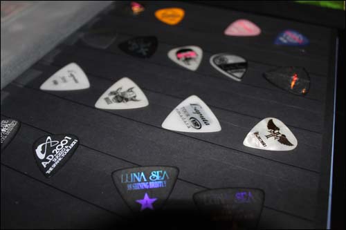 L’après-midi nous retournons à la gare d’Ochanomizu, pour acheter des guitares (pour des amis en France). C’est le quartier des étudiants et des librairies. On peut marchander un peu les prix. J’en profite pour m’acheter des médiators aux noms de mes groupes préférés pour 105 yens l’unité…