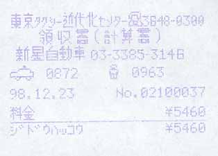 Mais notre aventure continue. Car il est 00 h 15, et il n’y a plus de métro pour retourner à Kiba ! Nous voilà donc partis à la recherche d’un taxi ! Ils ne manquent pas à la sortie de la gare, mais beaucoup sont déjà pris. Enfin, l’un d’entre eux s’arrête. Nous lui demandons de nous emmener à la station de métro de Kiba. Il démarre puis quelques rues plus tard, il s’arrête. Interrogation ? Ne connaît-il pas la route ? Il consulte son plan… Puis redémarre. Dans les rues nous rencontrerons 90 % de taxis, et quasiment aucune voiture particulière, c’est un spectacle surnaturel. Lorsque nous roulons j’ai l’œil rivé sur le compteur qui augmente de 80 ¥ toutes les minutes Et arrivée à Kiba il ne me reste plus qu’à sortir mon porte-monnaie. Le taxi est cher au Japon ! 5 460 ¥ pour une traversée de Tôkyô la nuit…