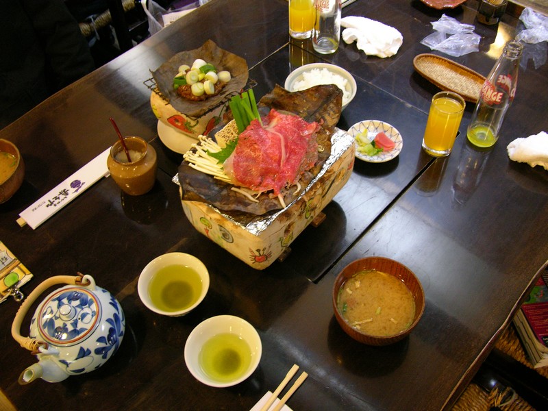Nous partons à la recherche d’un restaurant avec la spécialité du coin le hoba-miso (Il s’agit d’un plat de légumes et de viande de bœuf cuit sur une feuille de magnolia accompagné d’une soupe miso). Le bœuf d’Hida est très réputé au Japon. Nous suivons les indications du Lonely planet et après quelques recherchent nous trouvons le Suzuya.