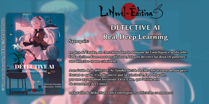 DÉTECTIVE AI: Real Deep Learning est une enquête policière sur fond d’intelligence artificielle. Il s’agit d’un roman écrit par Yabusaka Hayasaka et illustré par VOFAN. LaNovel Édition est une maison d’édition française spécialisée dans la traduction de light novels japonais. Leur romans sont disponibles dans un premier temps au format numérique et un mois plus tard au format papier en A5. Cette toute petite maison d’édition qui a débuté l’année dernière a connu des difficultés pour se faire connaître à cause de la pandémie et des annulation de convention. Elle a tout de même reçu le soutient de nombreux contributeurs avec le financement participatif.